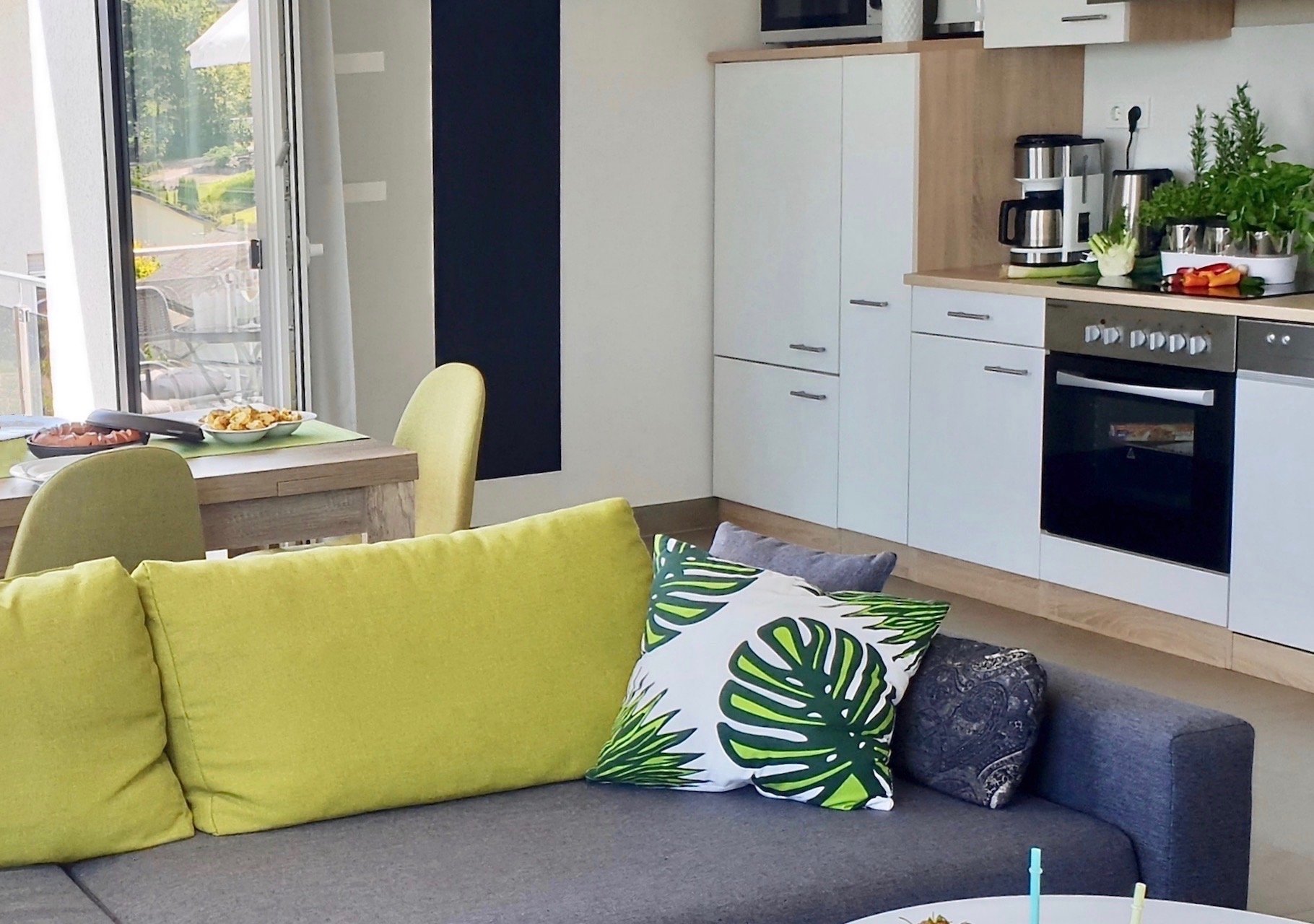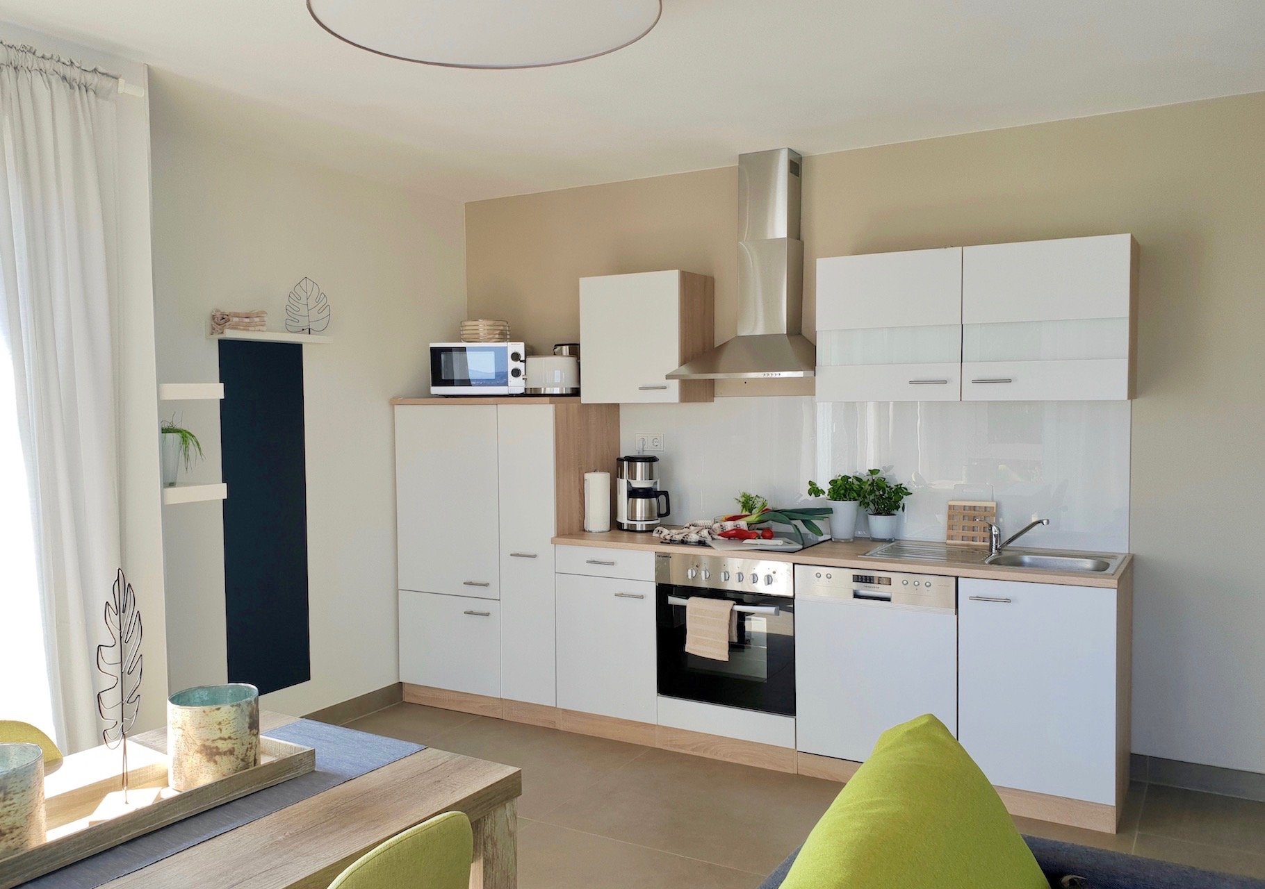- komplett ausgestattete Küchenzeile mit: E-Herd, Backofen, Kühlschrank mit Gefrierfach, Geschirrspüler, Kaffeemaschine, Wasserkocher, Toaster, Eierkocher, großzügiges Koch- und Essgeschirr,