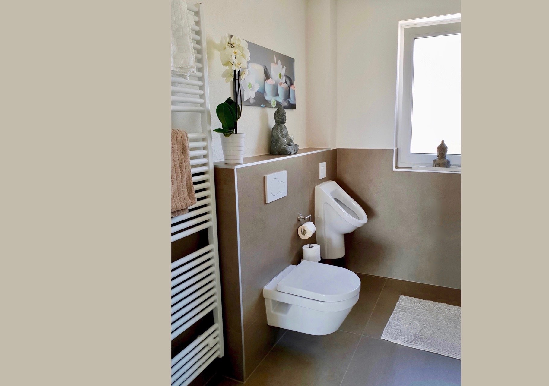 - 1 Badezimmer mit Fenster, begehbare Dusche, WC, Urinal, Schminkspiegel, Föhn, Badhocker, Handtuchwärmer, Handtücher