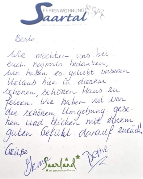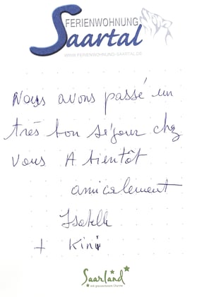 Vielen Dank für den schönen Aufenthalt bei Euch im Hause Saartal... es war alles Perfekt, sehr Sauber und liebevoll Eingerichtet.. und für Fragen standen Sie uns immer zur Verfügung.. Wir haben uns
