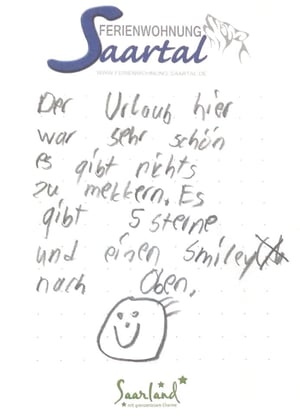 Wir hatten ein paar wunderschöne Tage bei Ihnen im Saarland. Die Ferienwohnung (die Eine) ist sehr schön eingerichtet und in einem top Zustand. An der Sauberkeit gab es nichts zu bemängeln. Die Küche war voll ausgestattet. Familie Schulien war immer erreichbar und sehr hilfsbereit. Mit der kostenlosen Saarlandcard konnten wir einige Eintrittsgelder sparen. Wir können die Ferienwohnung auf jeden Fall weiter empfehlen. Viele Grüße aus dem Schwarzwald!